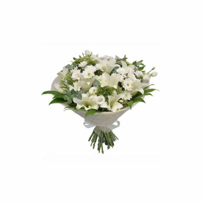 זר פרחים טרי ורענן שזור משלל פרחים לבנים וצחורים משולב עלי ירק רעננים עטוף באריזה לבנה מותאם בשלמות לפרחים הלבנים וצלופן. הזר מורכב משושן צחור טרי, גרברות לבנות, ענפי ליזיאנטוס, חרציות מן השדה ועלים ירקרקים שמשתלבים בהרמוניה עם הפרחים הלבנים.