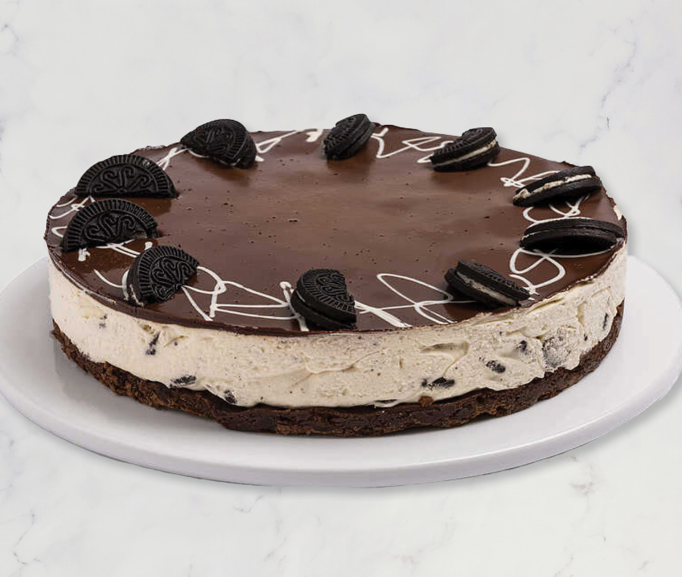 תחתית של בראוניז, מעליה קרם אוראו עשיר וציפוי גנאש שוקולד מריר וקישוט עוגיות אוראו.